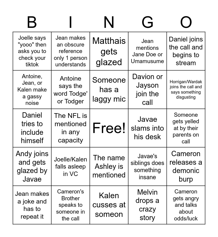 This bingo card has a free space and 24 words: Joelle/Kalen falls asleep in VC, Cameron's Brother speaks to someone in the call, Someone has a laggy mic, Jean makes a joke and has to repeat it, Daniel joins the call and begins to stream, Joelle says "yooo" then asks you to check your tiktok, Antoine, Jean, or Kalen make a gassy noise, Jean makes an obscure reference only 1 person understands, Javae slams into his desk, The name Ashley is mentioned, Davion or Jayson join the call, Daniel tries to include himself, Javae's siblings does something insane, Cameron releases a demonic burp, Antoine says the word Todge' or Todger, Melvin drops a crazy story, Someone gets yelled at by their parents on call, Matthais gets glazed, Horrigan/Wardak joins the call and says something disgusting, The NFL is mentioned in any capacity, Cameron gets angry and talks about odds/luck, Andy joins and gets glazed by Javae, Jean mentions Jane Doe or Umamusume and Kalen cusses at someon.