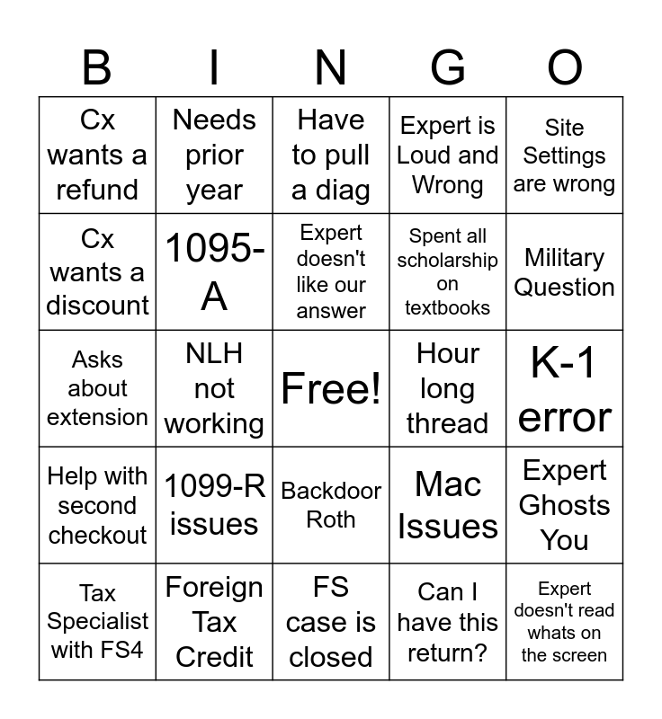 This bingo card has a free space and 34 words: Not in Write Mode, Can I have this return?, I can't do this state, What address do I use, Help with second checkout, 1095-A, Site Settings are wrong, Tax Specialist with FS4, Needs prior year, Spouses need separate states, Expert doesn't like our answer, Have to pull a diag, Fix rejected return, Expert wants to commit fraud, Hour long thread, Military Question, Foreign Tax Credit, Asks about extension, 1099-R issues, Mac Issues, Backdoor Roth, Expert ends Chat, Cx wants a refund, K-1 error, FS case is closed, Expert doesn't read whats on the screen, Expert is Loud and Wrong, DM from Experts Manager, Spent all scholarship on textbooks, Cx wants a discount, Expert wants a huddle, NLH not working, Expert Ghosts You and Needs an Amendment.