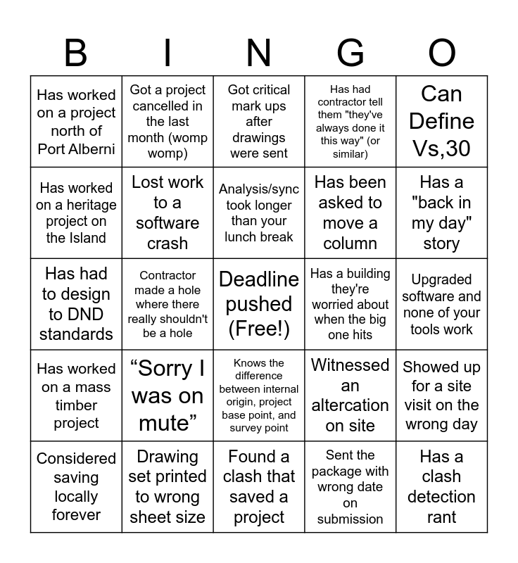 This bingo card has a free space and 24 words: “Sorry I was on mute”, Drawing set printed to wrong sheet size, Analysis/sync took longer than your lunch break, Considered saving locally forever, Can Define Vs,30, Has worked on a project north of Port Alberni, Has worked on a heritage project on the Island, Got a project cancelled in the last month (womp womp), Has a building they're worried about when the big one hits, Knows the difference between internal origin, project base point, and survey point, Has been asked to move a column, Has had to design to DND standards, Witnessed an altercation on site, Showed up for a site visit on the wrong day, Lost work to a software crash, Sent the package with wrong date on submission, Upgraded software and none of your tools work, Got critical mark ups after drawings were sent, Has a "back in my day" story, Contractor made a hole where there really shouldn't be a hole, Has a clash detection rant, Has worked on a mass timber project, Has had contractor tell them "they've always done it this way" (or similar) and Found a clash that saved a project.