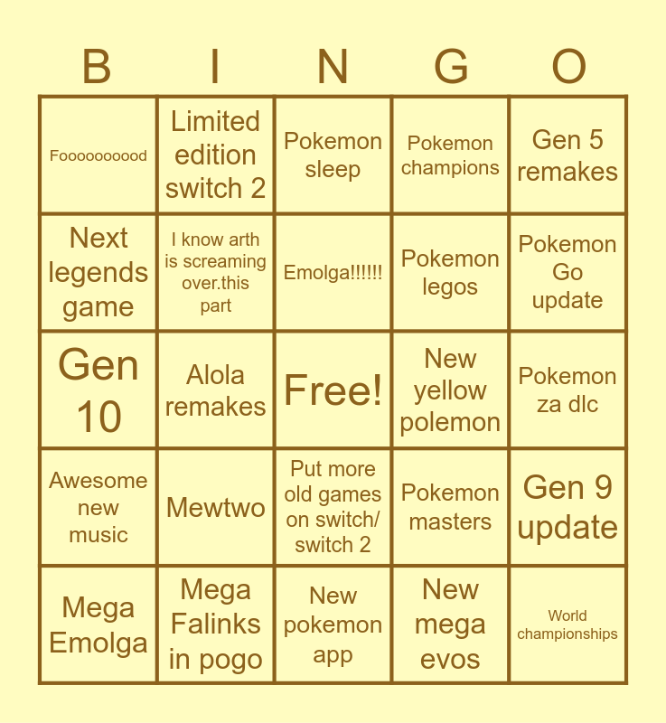 This bingo card has a free space and 24 words: Mewtwo, Mega Falinks in pogo, Emolga!!!!!!, Mega Emolga, Gen 5 remakes, Foooooooood, Next legends game, Limited edition switch 2, New yellow polemon, Put more old games on switch/ switch 2, Pokemon legos, Gen 10, Pokemon masters, Gen 9 update, I know arth is screaming over.this part, New mega evos, Pokemon za dlc, Pokemon sleep, Pokemon Go update, Alola remakes, World championships, Awesome new music, Pokemon champions and New pokemon app.
