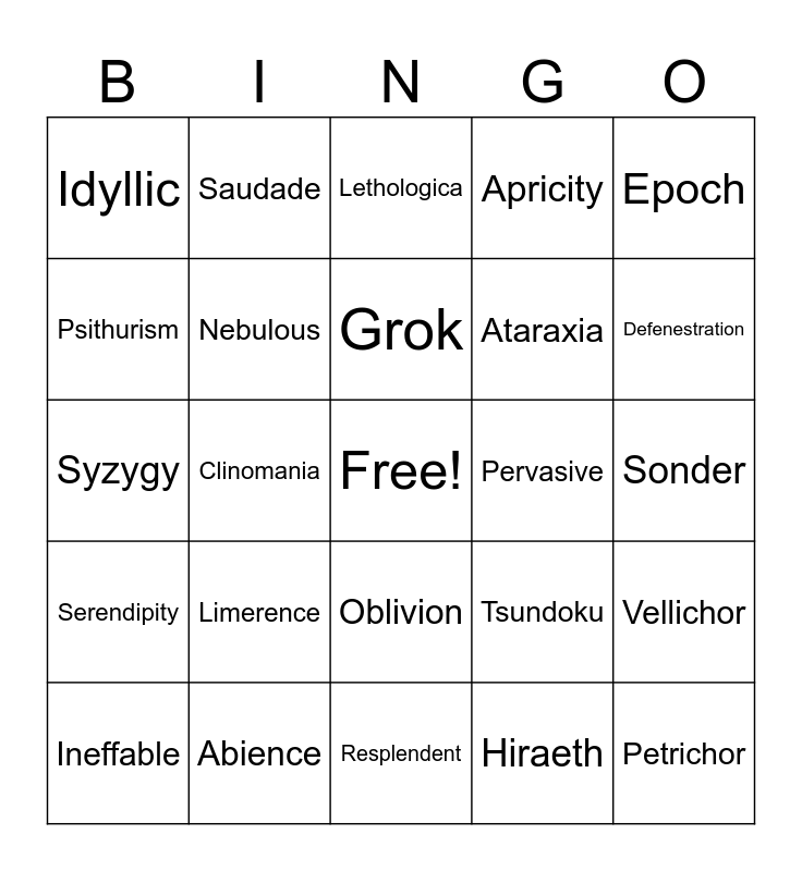 This bingo card has a free space and 30 words: Abience, Bioluminescence, Clinomania, Effervescence, Idyllic, Lethologica, Nebulous, Oblivion, Pervasive, Resplendent, Sonder, Petrichor, Hiraeth, Mellifluous, Defenestration, Ethereal, Tsundoku, Serendipity, Limerence, Epoch, Syzygy, Komorebi, Saudade, Ataraxia, Psithurism, Apricity, Vellichor, Ineffable, Grok and Aquiver.