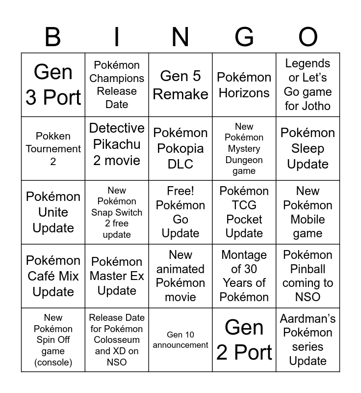 This bingo card has a free space and 24 words: Pokémon Master Ex Update, Release Date for Pokémon Colosseum and XD on NSO, Pokémon Pokopia DLC, New Pokémon Spin Off game (console), Legends or Let’s Go game for Jotho, Gen 3 Port, Pokken Tournement 2, Pokémon Champions Release Date, Pokémon TCG Pocket Update, New animated Pokémon movie, New Pokémon Mystery Dungeon game, Pokémon Unite Update, Montage of 30 Years of Pokémon, Pokémon Pinball coming to NSO, Detective Pikachu 2 movie, Gen 2 Port, New Pokémon Mobile game, Gen 5 Remake, Pokémon Sleep Update, New Pokémon Snap Switch 2 free update, Aardman’s Pokémon series Update, Pokémon Café Mix Update, Pokémon Horizons and Gen 10 announcement.
