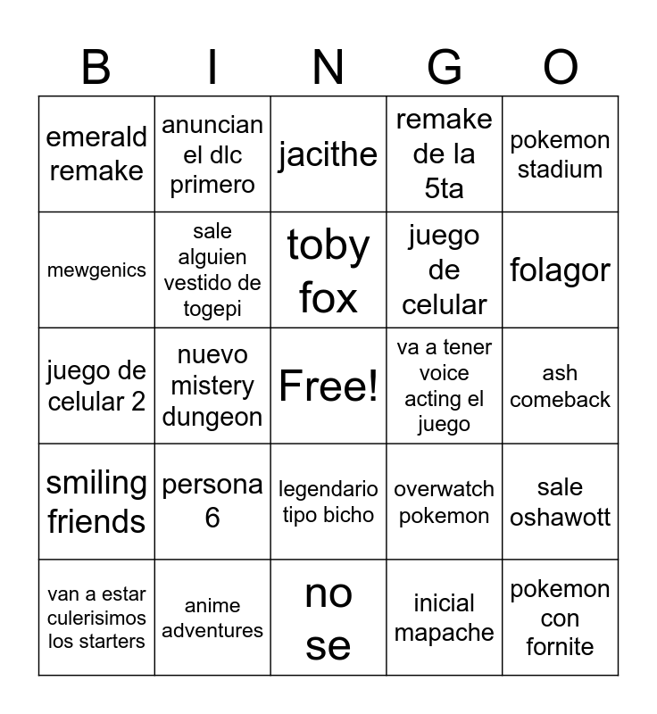 This bingo card has a free space and 24 words: persona 6, anime adventures, toby fox, van a estar culerisimos los starters, pokemon stadium, emerald remake, mewgenics, anuncian el dlc primero, va a tener voice acting el juego, legendario tipo bicho, juego de celular, juego de celular 2, overwatch pokemon, sale oshawott, sale alguien vestido de togepi, inicial mapache, ash comeback, jacithe, folagor, nuevo mistery dungeon, pokemon con fornite, smiling friends, remake de la 5ta and no se.