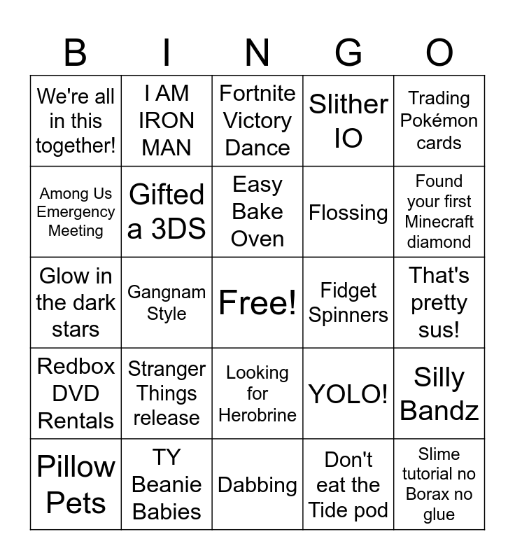 This bingo card has a free space and 29 words: Pillow Pets, Leap Frog Games, Gangnam Style, Crocks with socks, We're all in this together!, Fortnite Victory Dance, Gifted a 3DS, Stranger Things release, Fidget Spinners, TY Beanie Babies, That's pretty sus!, Slime tutorial no Borax no glue, Dabbing, Don't eat the Tide pod, Found your first Minecraft diamond, Wheelies, Looking for Herobrine, Redbox DVD Rentals, Trading Pokémon cards, Glow in the dark stars, YOLO!, Airforce 1s, Flossing, Among Us Emergency Meeting, Slither IO, I AM IRON MAN, Silly Bandz, Easy Bake Oven and Mini Brands.