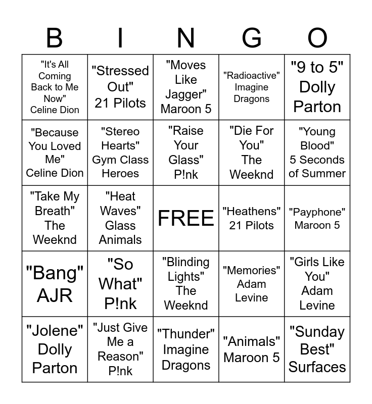 This bingo card has a free space and 24 words: "So What" P!nk, "Just Give Me a Reason" P!nk, "Raise Your Glass" P!nk, "Jolene" Dolly Parton, "9 to 5" Dolly Parton, "It's All Coming Back to Me Now" Celine Dion, "Because You Loved Me" Celine Dion, "Stressed Out" 21 Pilots, "Heathens" 21 Pilots, "Blinding Lights" The Weeknd, "Die For You" The Weeknd, "Take My Breath" The Weeknd, "Memories" Adam Levine, "Girls Like You" Adam Levine, "Stereo Hearts" Gym Class Heroes, "Animals" Maroon 5, "Payphone" Maroon 5, "Moves Like Jagger" Maroon 5, "Young Blood" 5 Seconds of Summer, "Heat Waves" Glass Animals, "Sunday Best" Surfaces, "Bang" AJR, "Radioactive" Imagine Dragons and "Thunder" Imagine Dragons.