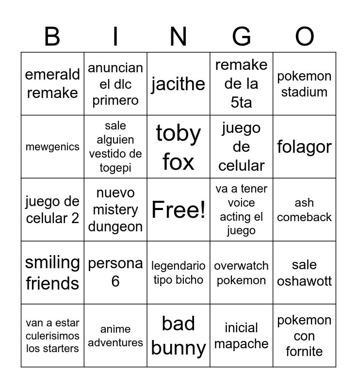 This bingo card has a free space and 24 words: persona 6, anime adventures, toby fox, van a estar culerisimos los starters, pokemon stadium, emerald remake, mewgenics, anuncian el dlc primero, va a tener voice acting el juego, legendario tipo bicho, juego de celular, juego de celular 2, overwatch pokemon, sale oshawott, sale alguien vestido de togepi, inicial mapache, ash comeback, jacithe, folagor, nuevo mistery dungeon, pokemon con fornite, smiling friends, remake de la 5ta and bad bunny.