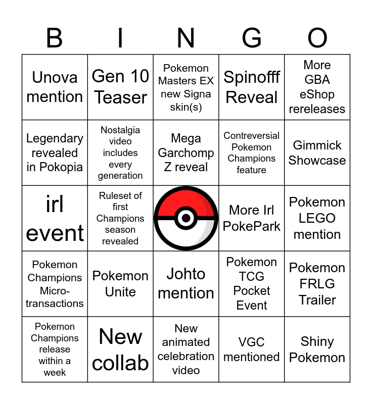 This bingo card has a free space and 24 words: Pokemon Champions release within a week, Pokemon Unite, Mega Garchomp Z reveal, VGC mentioned, More GBA eShop rereleases, Unova mention, Gen 10 Teaser, Pokemon Masters EX new Signa skin(s), More Irl PokePark, Pokemon LEGO mention, irl event, Nostalgia video includes every generation, Pokemon TCG Pocket Event, Pokemon FRLG Trailer, Legendary revealed in Pokopia, New collab, New animated celebration video, Spinofff Reveal, Gimmick Showcase, Pokemon Champions Micro-transactions, Ruleset of first Champions season revealed, Johto mention, Contreversial Pokemon Champions feature and Shiny Pokemon.