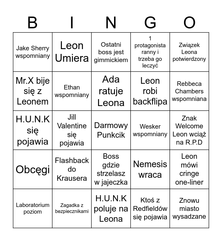 This bingo card has a free space and 24 words: Flashback do Krausera, Zagadka z bezpiecznikami, Ada ratuje Leona, Laboratorium poziom, Związek Leona potwierdzony, Jake Sherry wspomniany, Mr.X bije się z Leonem, Leon Umiera, Wesker wspomniany, Boss gdzie strzelasz w jajeczka, Leon robi backflipa, H.U.N.K się pojawia, Nemesis wraca, Leon mówi cringe one-liner, Ethan wspomniany, Ktoś z Redfieldów się pojawia, Znak Welcome Leon wciąż na R.P.D, Ostatni boss jest gimmickiem, Rebbeca Chambers wspomniana, Jill Valentine się pojawia, Znowu miasto wysadzane, Obcęgi, 1 protagonista ranny i trzeba go leczyć and H.U.N.K poluje na Leona.