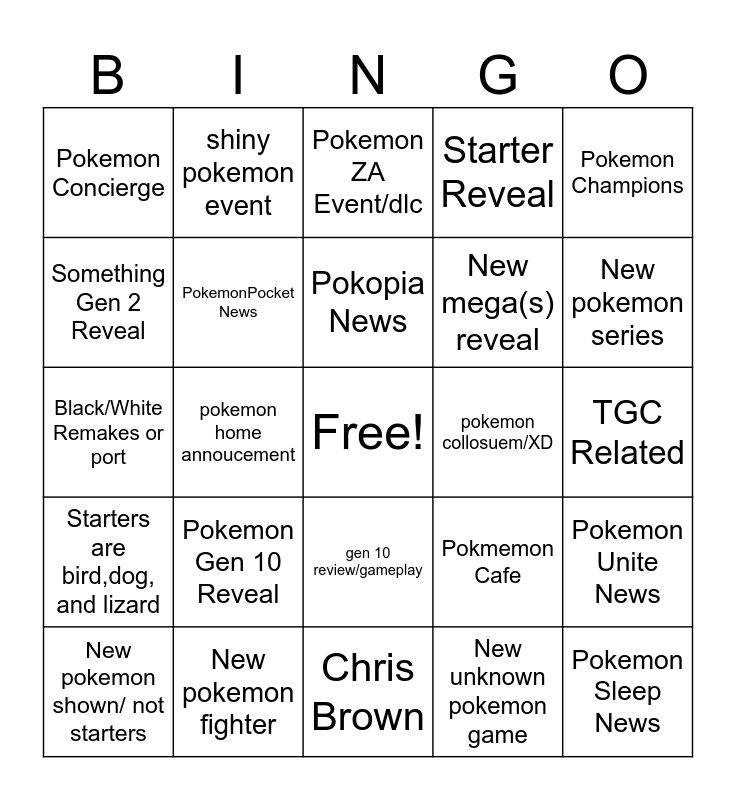 This bingo card has a free space and 24 words: Pokemon Gen 10 Reveal, New pokemon fighter, Pokopia News, New pokemon shown/ not starters, Pokemon Champions, Pokemon Concierge, Something Gen 2 Reveal, shiny pokemon event, pokemon collosuem/XD, gen 10 review/gameplay, New mega(s) reveal, Black/White Remakes or port, Pokmemon Cafe, Pokemon Unite News, PokemonPocket News, New unknown pokemon game, TGC Related, Pokemon ZA Event/dlc, New pokemon series, pokemon home annoucement, Pokemon Sleep News, Starters are bird,dog, and lizard, Starter Reveal and Chris Brown.