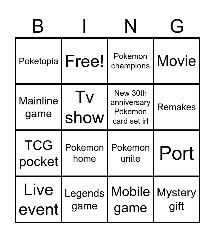 This bingo card has 16 words: Legends game, Port, Pokemon champions, Poketopia, TCG pocket, Free!, Pokemon unite, Mobile game, Mainline game, Tv show, Live event, Movie, Pokemon home, Remakes, New 30th anniversary Pokemon card set irl and Mystery gift.