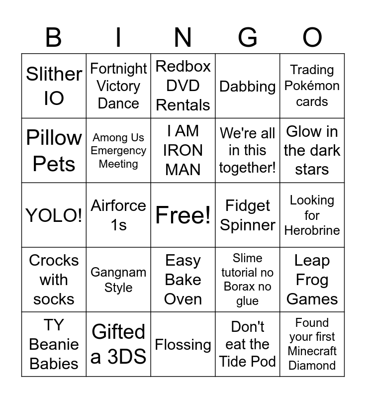 This bingo card has a free space and 29 words: TY Beanie Babies, Silly Bandz, Airforce 1s, Mini Brands, Slither IO, Redbox DVD Rentals, Among Us Emergency Meeting, Gangnam Style, Fidget Spinner, Gifted a 3DS, Looking for Herobrine, Found your first Minecraft Diamond, Flossing, Don't eat the Tide Pod, Glow in the dark stars, That's pretty Sus!, Easy Bake Oven, Crocks with socks, Trading Pokémon cards, YOLO!, Slime tutorial no Borax no glue, Stranger Things release, We're all in this together!, Pillow Pets, Dabbing, Fortnight Victory Dance, Leap Frog Games, I AM IRON MAN and Wheelies.