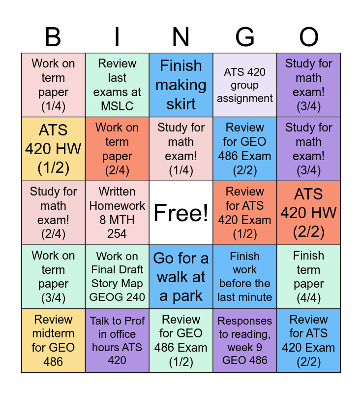 This bingo card has a free space and 24 words: Work on Final Draft Story Map GEOG 240, Talk to Prof in office hours ATS 420, Study for math exam! (1/4), Review midterm for GEO 486, Study for math exam! (3/4), Work on term paper (1/4), ATS 420 HW (1/2), Review last exams at MSLC, Review for ATS 420 Exam (1/2), Go for a walk at a park, Review for GEO 486 Exam (2/2), Study for math exam! (2/4), Finish work before the last minute, Finish term paper (4/4), Work on term paper (2/4), Responses to reading, week 9 GEO 486, ATS 420 HW (2/2), Finish making skirt, Study for math exam! (3/4), Written Homework 8 MTH 254, Review for ATS 420 Exam (2/2), Work on term paper (3/4), ATS 420 group assignment and Review for GEO 486 Exam (1/2).