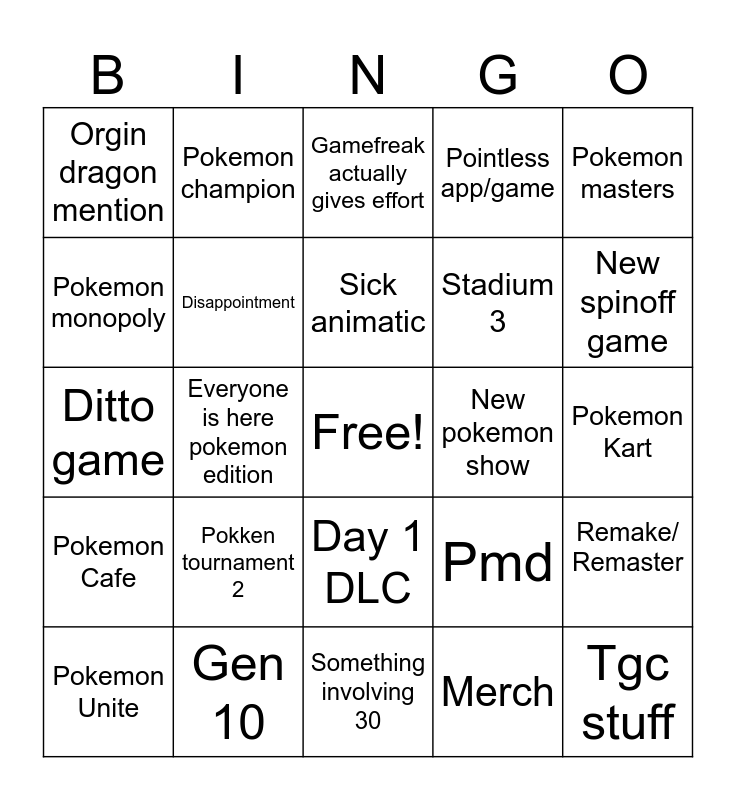 This bingo card has a free space and 24 words: Pokemon Unite, Pokken tournament 2, Sick animatic, Merch, Pokemon masters, Orgin dragon mention, Pokemon champion, Gamefreak actually gives effort, New pokemon show, Pokemon Kart, Ditto game, Disappointment, Pmd, Remake/ Remaster, Pokemon monopoly, Gen 10, Something involving 30, Pointless app/game, New spinoff game, Pokemon Cafe, Everyone is here pokemon edition, Day 1 DLC, Stadium 3 and Tgc stuff.