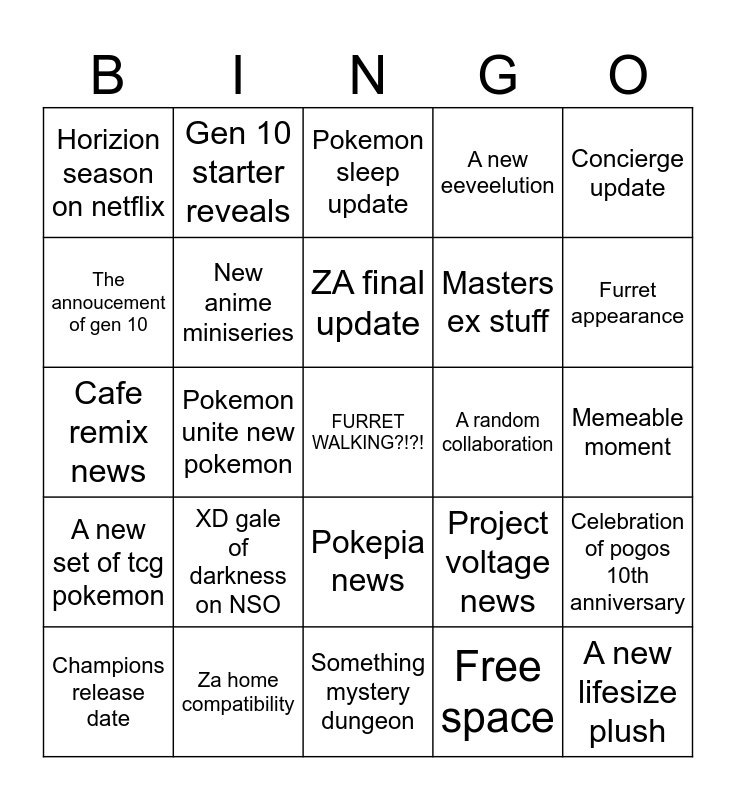 This bingo card has 25 words: XD gale of darkness on NSO, Something mystery dungeon, ZA final update, Champions release date, Concierge update, Horizion season on netflix, The annoucement of gen 10, Gen 10 starter reveals, A random collaboration, Pokepia news, Masters ex stuff, Cafe remix news, Project voltage news, Celebration of pogos 10th anniversary, New anime miniseries, A new lifesize plush, Memeable moment, Pokemon sleep update, Furret appearance, Pokemon unite new pokemon, FURRET WALKING?!?!, Za home compatibility, A new set of tcg pokemon, A new eeveelution and Free space.