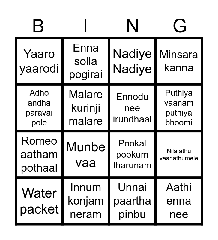 This bingo card has 63 words: Free!, Innisai paadi varum, Golden sparrow, Mellisaiye, Amma (Valimai), Oru deivam thande poove, Enna solla pogirai, Sundari kannal oru seithi, Puthiya vaanam puthiya bhoomi, Unnai kaanathu kannum, Raja raja Chozhan naan, Vaarayo vaarayo, Unnai paartha pinbu, Adho andha paravai pole, Megamai vanthu pogiren, Malare kurinji malare, Nila athu vaanathumele, Yaaro yaarodi, Chinna chinna aasai, Romeo aatham pothaal, Google google, Aathi enna nee, Minsara kanna, Naan aanaiyitaal, Azhagiya Laila, Thillana Thillana, Thalapathy Kacheri, Maanguyilae poonguyilae, Ennavo Ennavo, Selfie pulla, Manmadhane nee, Amma endrazhaikaatha, Aayiram jannal veedu, Engal veethil ella naalum karthigai, Munbe vaa, Vennilave saaral nee, Enakke enakkaa, Malare mounama, Kalyana maalai, Ennodu nee irundhaal, Pookal pookum tharunam, Innum konjam neram, Mannil indha kadhal, Pottala Muttaya, Water packet, Oorum blood, Manasilaayo, Ranjithame, Rowdy baby, Thillana thillana, Mukkala Mukkabala, Soniya Soniya, Onakkaage Poranthaenae, Enna Ninatche, Appadi podu, Nadiye Nadiye, Nee singam thaan, Mudhal kanave, Amma (Varisu), Aal thotha boopathi, Vaayadi petta pillai, Tenmerku paravai Kaatru and Thithikudhe.