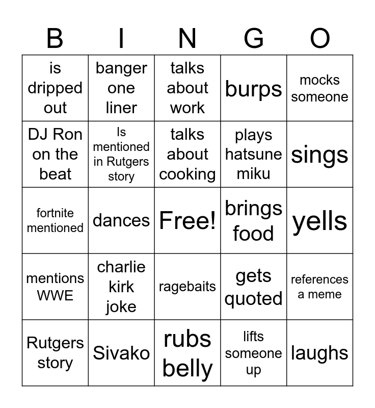This bingo card has a free space and 24 words: charlie kirk joke, Sivako, talks about cooking, Rutgers story, mocks someone, is dripped out, DJ Ron on the beat, banger one liner, brings food, ragebaits, plays hatsune miku, fortnite mentioned, gets quoted, references a meme, Is mentioned in Rutgers story, lifts someone up, yells, talks about work, sings, dances, laughs, mentions WWE, burps and rubs belly.