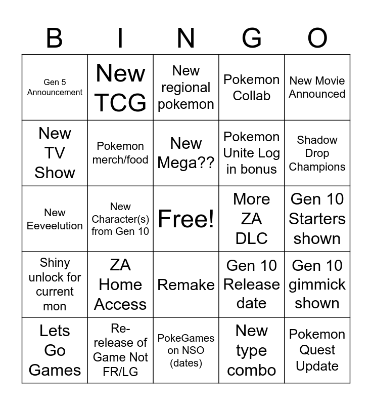 This bingo card has a free space and 24 words: ZA Home Access, Re-release of Game Not FR/LG, New Mega??, Lets Go Games, New Movie Announced, Gen 5 Announcement, New TV Show, New TCG, More ZA DLC, Remake, Pokemon Unite Log in bonus, New Eeveelution, Gen 10 Release date, Gen 10 gimmick shown, Pokemon merch/food, New type combo, Gen 10 Starters shown, New regional pokemon, Shadow Drop Champions, New Character(s) from Gen 10, Pokemon Quest Update, Shiny unlock for current mon, Pokemon Collab and PokeGames on NSO (dates).
