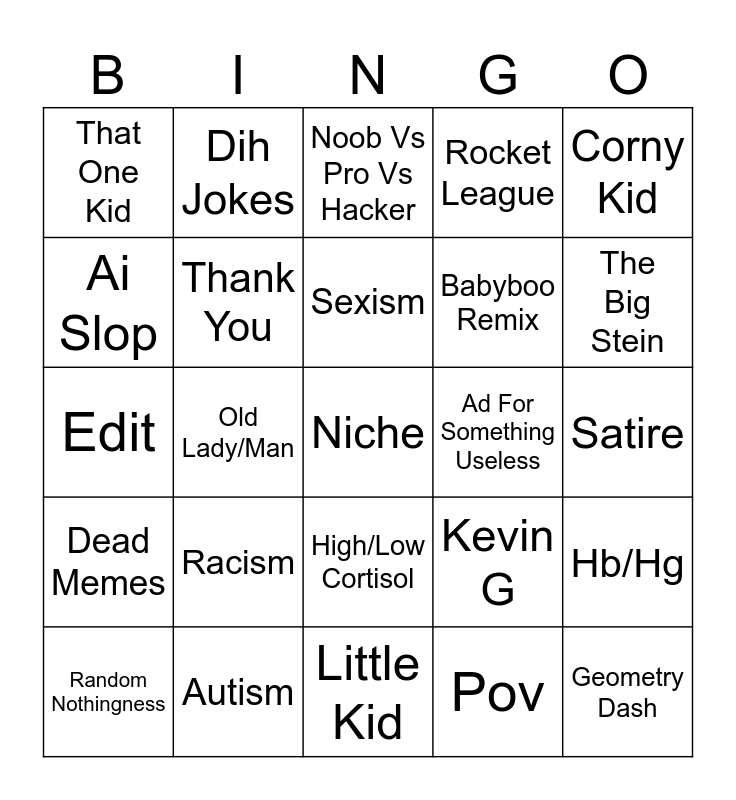 This bingo card has a free space and 24 words: Racism, Autism, Sexism, Random Nothingness, Corny Kid, That One Kid, Ai Slop, Dih Jokes, Ad For Something Useless, High/Low Cortisol, Babyboo Remix, Edit, Kevin G, Hb/Hg, Thank You, Pov, Satire, Noob Vs Pro Vs Hacker, The Big Stein, Old Lady/Man, Geometry Dash, Dead Memes, Rocket League and Little Kid.