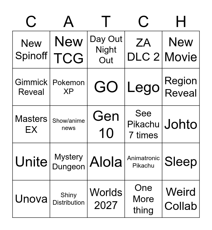 This bingo card has a free space and 24 words: Unova, Mystery Dungeon, GO, One More thing, New Movie, New Spinoff, New TCG, Day Out Night Out, See Pikachu 7 times, Johto, Masters EX, Pokemon XP, Animatronic Pikachu, Sleep, Gimmick Reveal, Shiny Distribution, Worlds 2027, ZA DLC 2, Region Reveal, Unite, Show/anime news, Alola, Lego and Weird Collab.