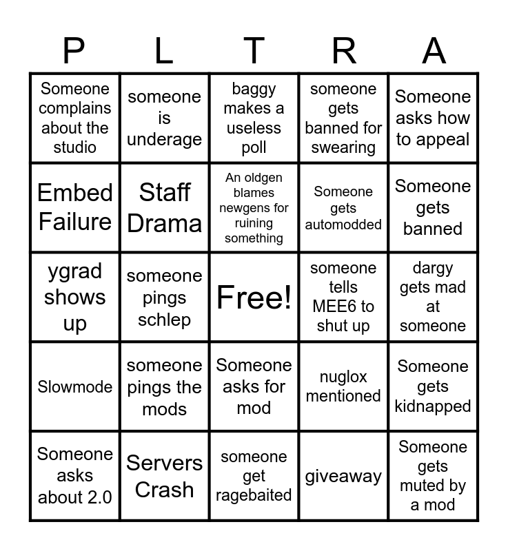 This bingo card has a free space and 24 words: someone pings the mods, Servers Crash, An oldgen blames newgens for ruining something, Someone asks about 2.0, Someone asks how to appeal, Someone complains about the studio, Embed Failure, someone is underage, someone tells MEE6 to shut up, Someone asks for mod, Someone gets automodded, ygrad shows up, nuglox mentioned, Someone gets kidnapped, Staff Drama, giveaway, dargy gets mad at someone, baggy makes a useless poll, Someone gets banned, someone pings schlep, Someone gets muted by a mod, Slowmode, someone gets banned for swearing and someone get ragebaited.