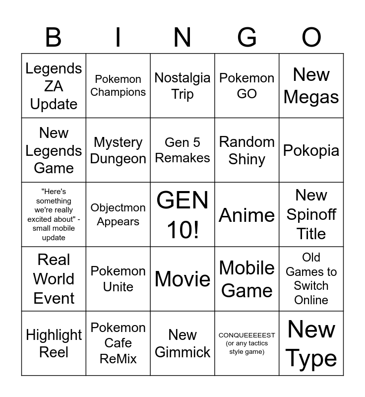 This bingo card has a free space and 24 words: Pokemon Unite, Pokemon Cafe ReMix, Gen 5 Remakes, Highlight Reel, New Megas, Legends ZA Update, New Legends Game, Pokemon Champions, Anime, Movie, Random Shiny, "Here's something we're really excited about" - small mobile update, Mobile Game, Old Games to Switch Online, Mystery Dungeon, CONQUEEEEEST (or any tactics style game), New Spinoff Title, Nostalgia Trip, Pokopia, Objectmon Appears, New Type, Real World Event, Pokemon GO and New Gimmick.