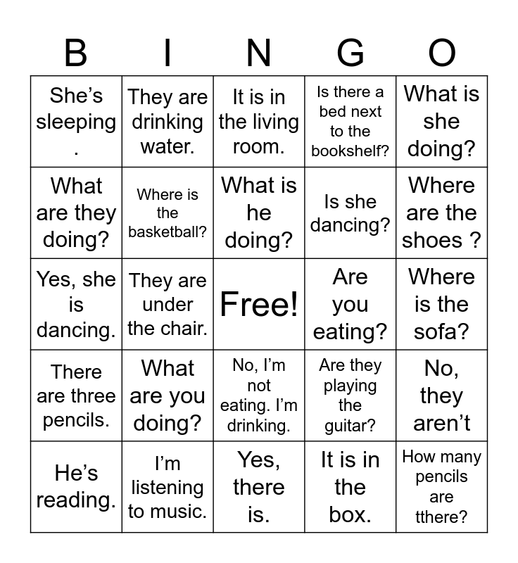 This bingo card has a free space and 24 words: What are you doing?, I’m listening to music., What is he doing?, He’s reading., What is she doing?, She’s sleeping ., What are they doing?, They are drinking water., Are you eating?, No, I’m not eating. I’m drinking., Is she dancing?, Yes, she is dancing., Are they playing the guitar?, No, they aren’t, Where is the basketball?, It is in the box., Where is the sofa?, It is in the living room., Where are the shoes ?, They are under the chair., How many pencils are tthere?, There are three pencils., Is there a bed next to the bookshelf? and Yes, there is..