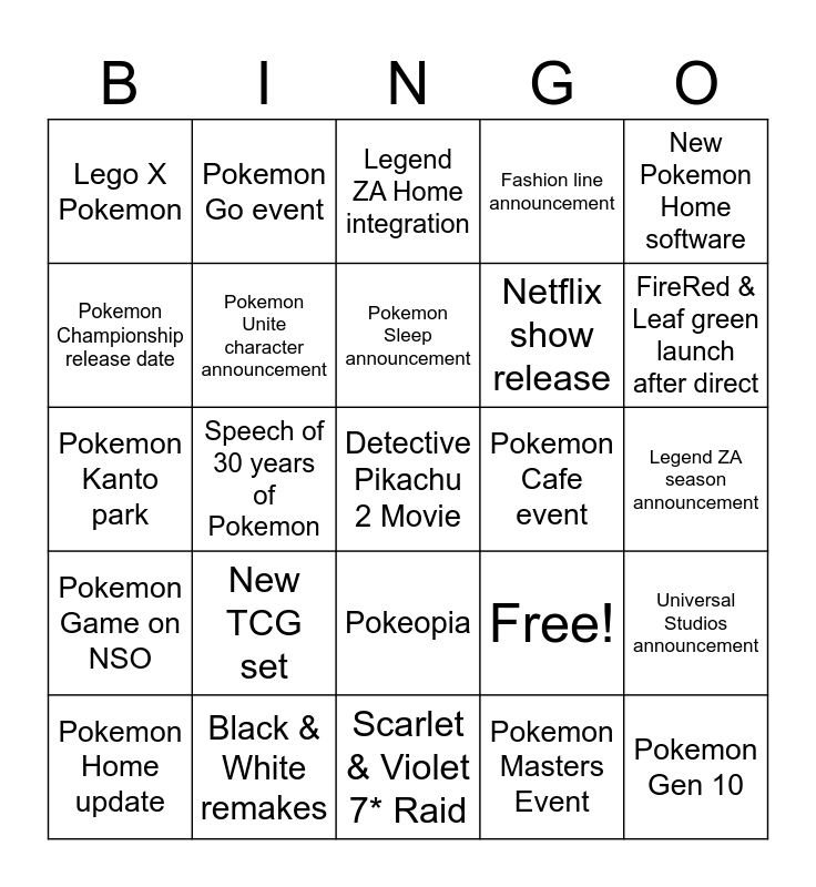 This bingo card has 25 words: New TCG set, Scarlet & Violet 7* Raid, Pokemon Sleep announcement, Pokemon Home update, New Pokemon Home software, Lego X Pokemon, Pokemon Championship release date, Pokemon Go event, Pokemon Cafe event, Pokeopia, Netflix show release, Pokemon Kanto park, Free!, Universal Studios announcement, Pokemon Unite character announcement, Pokemon Gen 10, Legend ZA season announcement, Legend ZA Home integration, FireRed & Leaf green launch after direct, Speech of 30 years of Pokemon, Detective Pikachu 2 Movie, Black & White remakes, Pokemon Game on NSO, Fashion line announcement and Pokemon Masters Event.