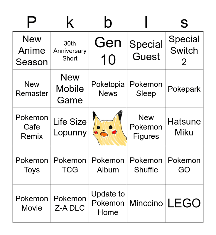 This bingo card has a free space and 24 words: Pokemon TCG, Pokemon Z-A DLC, Poketopia News, Pokemon Movie, Special Switch 2, New Anime Season, New Remaster, 30th Anniversary Short, New Pokemon Figures, Pokemon Album, Pokemon Sleep, Pokemon Cafe Remix, Pokemon Shuffle, Pokemon GO, New Mobile Game, Minccino, Hatsune Miku, Gen 10, Pokepark, Life Size Lopunny, LEGO, Pokemon Toys, Special Guest and Update to Pokemon Home.