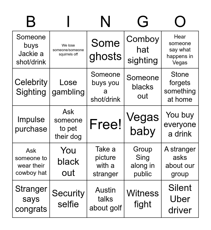 This bingo card has a free space and 66 words: Someone throws up, Someone passes out, Twinning, A stranger asks about our group, Nicole can't find her phone, Jackie can't find her phone, We lose someone/someone squirrels off, Get a stranger to join our group, Someone buys you a shot/drink, You buy someone a shot or a drink, Take a picture with a stranger, Find someone wearing the same outfit, You buy everyone a drink, Hear someone say what happens in Vegas, Impersonator Sighting, Celebrity Sighting, Ask someone to pet their dog, Someone buys Jackie a shot/drink, Someone buys Austin a shot/drink, Someone blacks out, You black out, Ask someone to wear their cowboy hat, Comboy hat sighting, Club card, No shoes, Bathroom line selfie, Hear club music at 11am, Talkative Uber driver, Silent Uber driver, Stranger dances with the group, Stranger says congrats, PDA sighting, Someone hits on a bartender/server, Bartender/Server hits on you, Group Sing along in public, Security selfie, Stranger yells, Impulse purchase, Witness fight, Win gambling, Lose gambling, Bottle pop!, Vegas baby, Twin mixup, Day nap aka booze snooze, Someone spills a drink, Stone forgets something at home, Too hungover to eat, Dance on table, Austin plays his music, Happy tears, Start chant, Big toast, Team no sleep, Band aid, Couple disappear together, Same drink order, Niles takes a picture of you, Some ghosts, Austin talks about golf, Blizzard, Someone talks about their pet, Hangover movie reference, Someone shares a fact about Vegas, Travis tells a story and Someone phone dies.