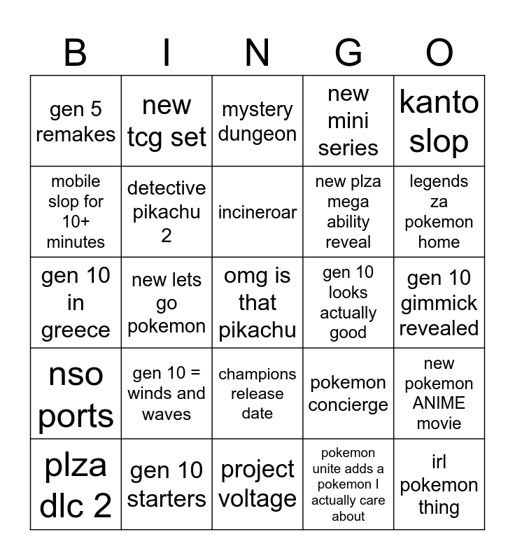 This bingo card has a free space and 24 words: gen 10 = winds and waves, gen 10 starters, incineroar, plza dlc 2, kanto slop, gen 5 remakes, mobile slop for 10+ minutes, new tcg set, gen 10 looks actually good, champions release date, new plza mega ability reveal, gen 10 in greece, pokemon concierge, new pokemon ANIME movie, detective pikachu 2, pokemon unite adds a pokemon I actually care about, gen 10 gimmick revealed, mystery dungeon, legends za pokemon home, new lets go pokemon, irl pokemon thing, nso ports, new mini series and project voltage.