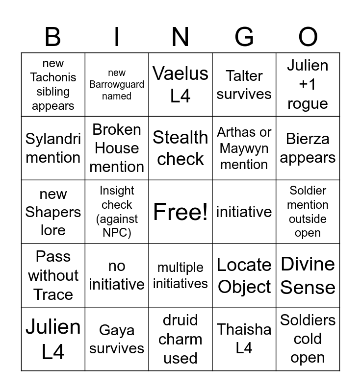 This bingo card has a free space and 45 words: Schemers cold open, Soldiers cold open, Seekers cold open, Julien L4, Occtis L4, Thaisha L4, Vaelus L4, Julien +1 fighter, Julien +1 rogue, Gaya survives, Talter survives, initiative, multiple initiatives, no initiative, level up outside of combat, druid charm used, bird spotted, new Shapers lore, Alogar appears, Bierza appears, new Barrowguard named, Petra and Ryah appear, Ethrand appears, new Tachonis sibling appears, Schemer mention outside open, Soldier mention outside open, Primus appears, Heat Metal, Locate Object, Pass without Trace, Speak with Animals, Divine Sense, Divine Smite, Arcana check, History check, Insight check (against NPC), Insight check (against PC), Investigation check, Perception check, Stealth check, Sylandri mention, Arthas or Maywyn mention, Tansul mention, Broken House mention and Stone of Nightsong does something.