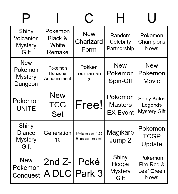 This bingo card has a free space and 24 words: Generation 10, 2nd Z-A DLC, Pokken Tournament 2, New Pokemon Conquest, Pokemon Champions News, Shiny Volcanion Mystery Gift, New Pokemon Mystery Dungeon, Pokemon Black & White Remake, Pokemon Masters EX Event, Pokemon GO Announcment, New Pokemon Spin-Off, Pokemon UNITE, Magikarp Jump 2, Pokemon TCGP Update, Pokemon Horizons Announcment, Shiny Hoopa Mystery Gift, Shiny Kalos Legends Mystery Gift, New Charizard Form, New Pokemon Movie, New TCG Set, Pokemon Fire Red & Leaf Green News, Shiny Diance Mystery Gift, Random Celebrity Partnership and Poké Park 3.