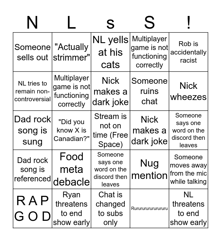 This bingo card has a free space and 41 words: Rob is accidentally racist, Dad rock song is sung, "Did you know X is Canadian?", Multiplayer game is not functioning correctly, Ryan threatens to end show early, Someone says one word on the discord then leaves, Nick makes a dark joke, Food meta debacle, Rob is accidentally racist, Dad rock song is referenced, "Did you know X is Canadian?", Multiplayer game is not functioning correctly, NL threatens to end show early, Someone says one word on the discord then leaves, Nick makes a dark joke, Food meta debacle, Really good/ Really bad metaphor, Someone sells out, Austin is great at a game, NL yells at his cats, Someone moves away from the mic while talking, MALF insults NL, Chat is changed to subs only, Someone ruins chat, [Rob coughs] "Go to the doctor!", NL is offended by Nick's opinions, Rururururururururu, Rob talks about cooking, Nick wheezes, NL mentions the specific year a media came out, Odd Canadian pronunciation, "Actually strimmer", R A P G O D, NL calls Rob Robert, Nug mention, NL tries to remain non-controversial, Rob makes up words, NL displays impressive geography knowledge, Accent/ Impression, chat confirms/denies fact from Rob and Austin defends Texas.