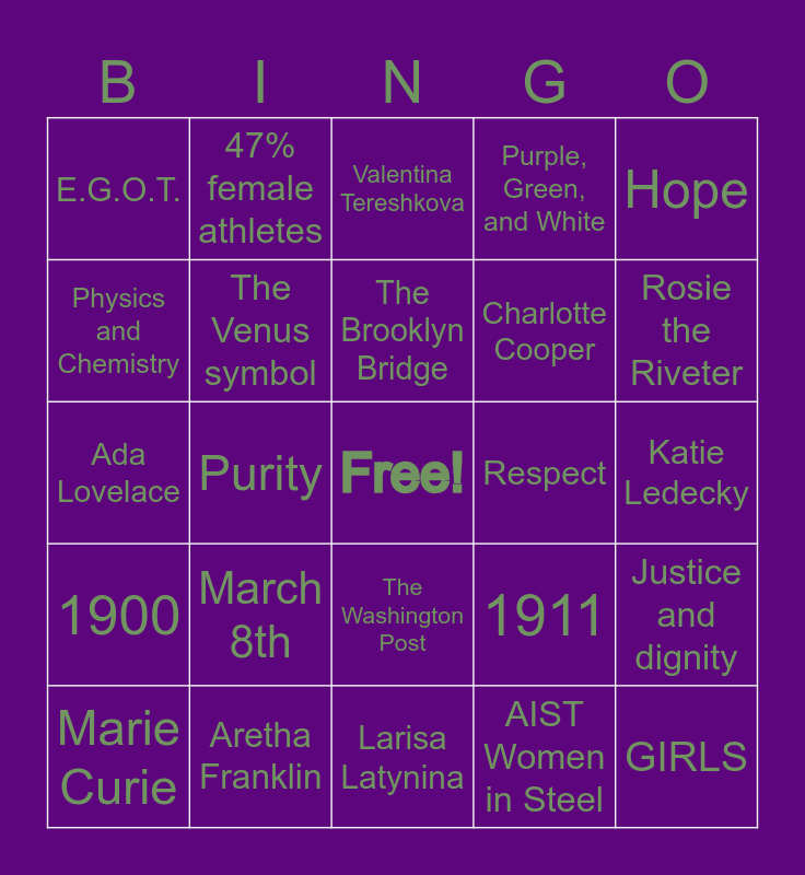 This bingo card has a free space and 24 words: Marie Curie, March 8th, The Brooklyn Bridge, AIST Women in Steel, Hope, E.G.O.T., 47% female athletes, Valentina Tereshkova, Respect, Katie Ledecky, Ada Lovelace, The Venus symbol, 1911, Justice and dignity, Physics and Chemistry, Aretha Franklin, Larisa Latynina, Purple, Green, and White, Rosie the Riveter, 1900, Purity, The Washington Post, Charlotte Cooper and GIRLS.