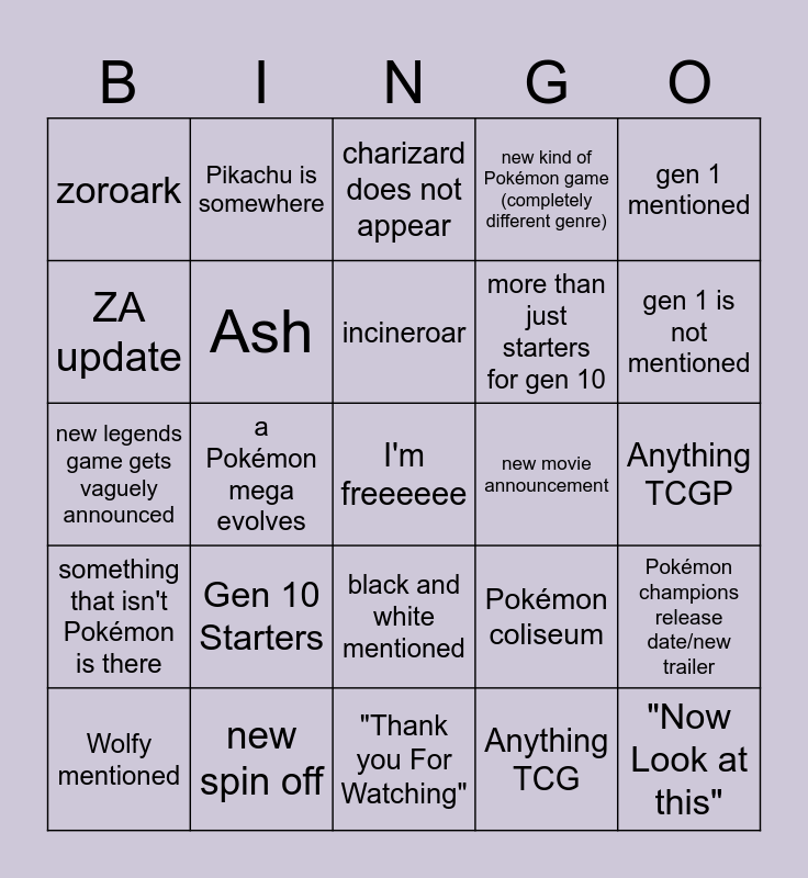 This bingo card has a free space and 24 words: Gen 10 Starters, new spin off, incineroar, Wolfy mentioned, gen 1 mentioned, zoroark, ZA update, Pikachu is somewhere, new movie announcement, black and white mentioned, more than just starters for gen 10, new legends game gets vaguely announced, Pokémon coliseum, Pokémon champions release date/new trailer, Ash, Anything TCG, Anything TCGP, charizard does not appear, gen 1 is not mentioned, a Pokémon mega evolves, "Now Look at this", something that isn't Pokémon is there, new kind of Pokémon game (completely different genre) and "Thank you For Watching".