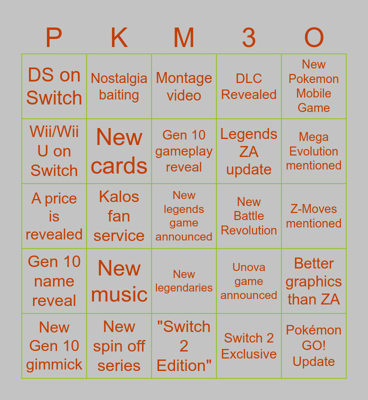 This bingo card has 35 words: Port/remake announced, New forms revealed, GameStop event, New cards, New legendaries, DLC Revealed, Wii/Wii U on Switch, Pokémon Champions, Gen 10 gameplay reveal, New anime season, A price is revealed, New Pokemon Mobile Game, Pikachu (Free space), New Mystery Dungeon, DS on Switch, New Battle Revolution, Switch 2 Exclusive, Kalos fan service, Gen 10 name reveal, New legends game announced, Unova game announced, New Gen 10 gimmick, Better graphics than ZA, New spin off series, Montage video, Mega Evolution mentioned, Pokémon GO! Update, New Pokémon, Legends ZA update, Z-Moves mentioned, Sales on the e-Shop, "Switch 2 Edition", New music, Nostalgia baiting and 2D Game.