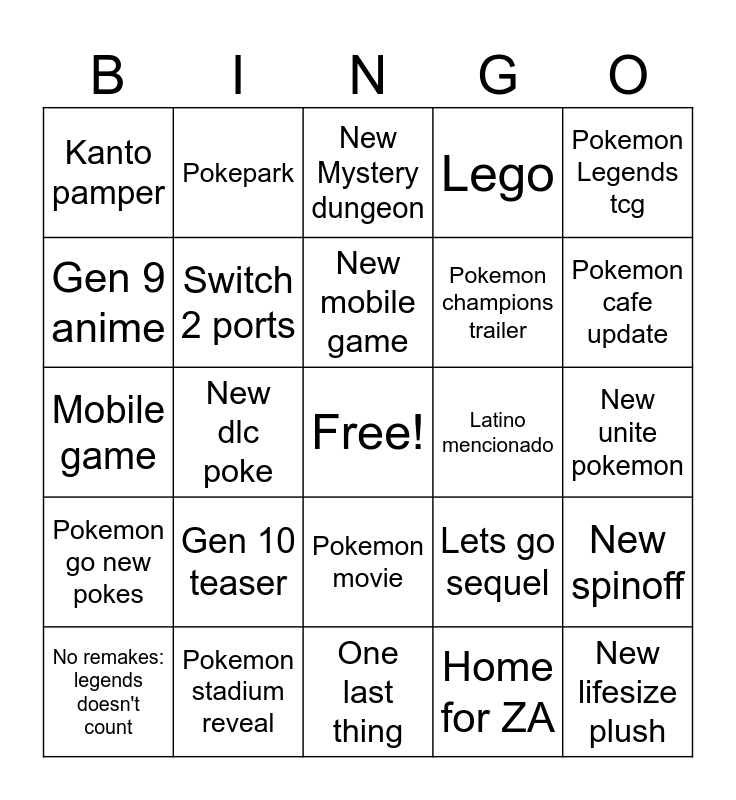This bingo card has a free space and 24 words: Gen 10 teaser, Pokemon stadium reveal, New mobile game, No remakes: legends doesn't count, Pokemon Legends tcg, Kanto pamper, Gen 9 anime, Pokepark, Latino mencionado, Pokemon movie, Pokemon champions trailer, Mobile game, Lets go sequel, New spinoff, Switch 2 ports, Home for ZA, New unite pokemon, New Mystery dungeon, Pokemon cafe update, New dlc poke, New lifesize plush, Pokemon go new pokes, Lego and One last thing.