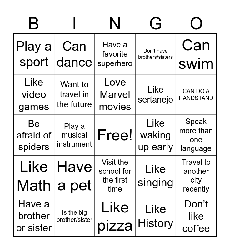 This bingo card has a free space and 25 words: Have a pet, Like pizza, Love Marvel movies, Have a brother or sister, Can swim, Play a sport, Like video games, Can dance, Like waking up early, Visit the school for the first time, Like sertanejo, Be afraid of spiders, Like singing, Travel to another city recently, Want to travel in the future, Can cook something by yourself, Speak more than one language, Have a favorite superhero, CAN DO A HANDSTAND, Play a musical instrument, Don’t like coffee, Is the big brother/sister, Like Math, Don’t have brothers/sisters and Like History.