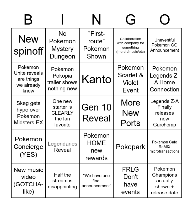 This bingo card has a free space and 24 words: Legendaries Reveal, Half the stream is disappointing, Kanto, New music video (GOTCHA-like), Uneventful Pokemon GO Announcement, New spinoff, Pokemon Unite reveals are things we already knew, No Pokemon Mystery Dungeon, More New Ports, Pokemon HOME new rewards, Pokemon Scarlet & Violet Event, Skeg gets hype over Pokemon Midsters EX, Pokepark, Pokemon Cafe ReMIX microtransactions, Pokemon Pokopia trailer shows nothing new, FRLG Don't have events, Legends Z-A Finally releases new Garchomp, "First-route" Pokemon Shown, Pokemon Legends Z-A Home Connection, One new starter is CLEARLY the fan favorite, Pokemon Champions actually shown + release date, Pokemon Concierge (YES), Collaboration with company for something (merch/music/etc) and "We have one final announcement".