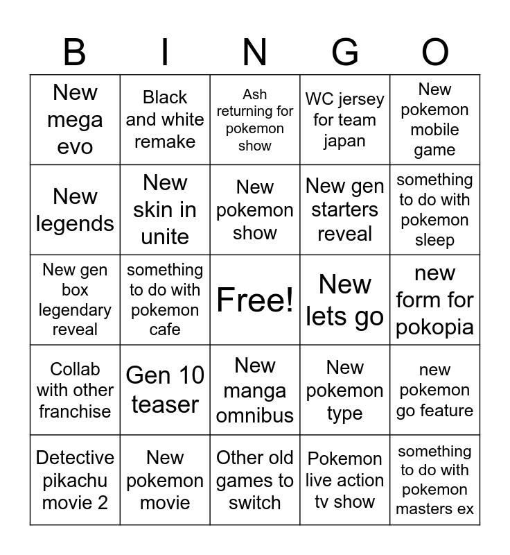 This bingo card has a free space and 24 words: Gen 10 teaser, New pokemon movie, New pokemon show, Detective pikachu movie 2, New pokemon mobile game, New mega evo, New legends, Black and white remake, New lets go, New manga omnibus, New gen starters reveal, New gen box legendary reveal, New pokemon type, new pokemon go feature, New skin in unite, Pokemon live action tv show, new form for pokopia, Ash returning for pokemon show, something to do with pokemon sleep, something to do with pokemon cafe, something to do with pokemon masters ex, Collab with other franchise, WC jersey for team japan and Other old games to switch.