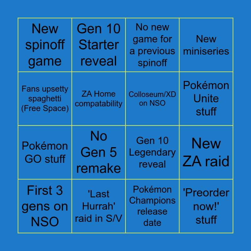 This bingo card has 16 words: 'Last Hurrah' raid in S/V, New ZA raid, No new game for a previous spinoff, New spinoff game, Pokémon GO stuff, Gen 10 Starter reveal, Gen 10 Legendary reveal, Pokémon Champions release date, Fans upsetty spaghetti (Free Space), ZA Home compatability, First 3 gens on NSO, New miniseries, No Gen 5 remake, Pokémon Unite stuff, Colloseum/XD on NSO and 'Preorder now!' stuff.