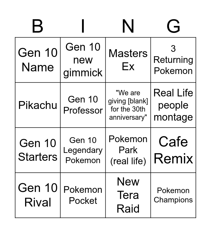 This bingo card has 16 words: Pokemon Pocket, Cafe Remix, Masters Ex, Gen 10 Name, Gen 10 Starters, Gen 10 new gimmick, Pokemon Park (real life), New Tera Raid, Pikachu, Gen 10 Professor, Gen 10 Rival, 3 Returning Pokemon, Gen 10 Legendary Pokemon, Real Life people montage, "We are giving [blank] for the 30th anniversary" and Pokemon Champions.