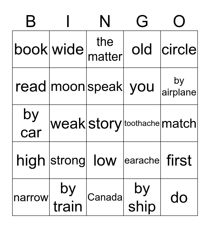 This bingo card has 65 words: correct, thin, sentence, first, fat, tall, wide, how, speak, new, low, that, match, circle, listen, read, weak, book, big, you, strong, high, old, small, fast, describe, this, short, story, long, narrow, word, stomachache, get, earache, by train, grandmother's house, by car, by ship, small island, moon, headache, toothache, cold, by subway, sore throat, by airplane, on foot, do, How, there, Fun Kids School, have a, Canada, neighborhood, fever, runny nose, the matter, What's, insect bite, I, by school bus, there, do and Fun Kids School.