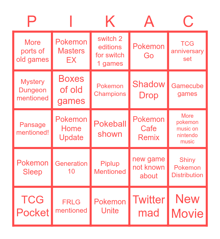 This bingo card has a free space and 24 words: Generation 10, FRLG mentioned, Pokemon Champions, TCG Pocket, TCG anniversary set, More ports of old games, Mystery Dungeon mentioned, Pokemon Masters EX, Pokemon Cafe Remix, Piplup Mentioned, Shadow Drop, Pansage mentioned!, new game not known about, Shiny Pokemon Distribution, Boxes of old games, Twitter mad, More pokemon music on nintendo music, switch 2 editions for switch 1 games, Gamecube games, Pokemon Home Update, New Movie, Pokemon Sleep, Pokemon Go and Pokemon Unite.