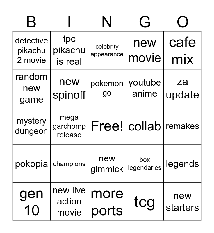 This bingo card has a free space and 24 words: gen 10, champions, pokemon go, tcg, cafe mix, detective pikachu 2 movie, tpc pikachu is real, celebrity appearance, collab, remakes, mystery dungeon, new spinoff, box legendaries, legends, random new game, new live action movie, more ports, new movie, za update, pokopia, mega garchomp release, new gimmick, youtube anime and new starters.