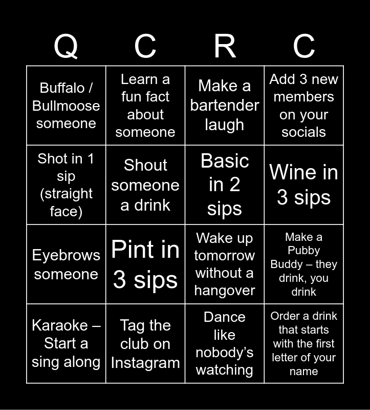This bingo card has 16 words: Tag the club on Instagram, Make a Pubby Buddy – they drink, you drink, Make a bartender laugh, Buffalo / Bullmoose someone, Eyebrows someone, Learn a fun fact about someone, Wake up tomorrow without a hangover, Dance like nobody’s watching, Shot in 1 sip (straight face), Shout someone a drink, Karaoke – Start a sing along, Add 3 new members on your socials, Pint in 3 sips, Wine in 3 sips, Basic in 2 sips and Order a drink that starts with the first letter of your name.
