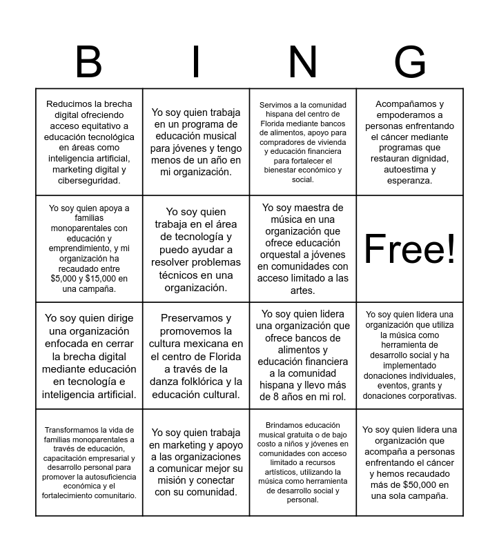 This bingo card has 17 words: Brindamos educación musical gratuita o de bajo costo a niños y jóvenes en comunidades con acceso limitado a recursos artísticos, utilizando la música como herramienta de desarrollo social y personal., Transformamos la vida de familias monoparentales a través de educación, capacitación empresarial y desarrollo personal para promover la autosuficiencia económica y el fortalecimiento comunitario., Servimos a la comunidad hispana del centro de Florida mediante bancos de alimentos, apoyo para compradores de vivienda y educación financiera para fortalecer el bienestar económico y social., Reducimos la brecha digital ofreciendo acceso equitativo a educación tecnológica en áreas como inteligencia artificial, marketing digital y ciberseguridad., Preservamos y promovemos la cultura mexicana en el centro de Florida a través de la danza folklórica y la educación cultural., Acompañamos y empoderamos a personas enfrentando el cáncer mediante programas que restauran dignidad, autoestima y esperanza., Yo soy quien lidera una organización que utiliza la música como herramienta de desarrollo social y ha implementado donaciones individuales, eventos, grants y donaciones corporativas., Yo soy maestra de música en una organización que ofrece educación orquestal a jóvenes en comunidades con acceso limitado a las artes., Free!, Yo soy quien trabaja en el área de tecnología y puedo ayudar a resolver problemas técnicos en una organización., Yo soy quien trabaja en marketing y apoyo a las organizaciones a comunicar mejor su misión y conectar con su comunidad., Yo soy quien lidera una organización que ofrece bancos de alimentos y educación financiera a la comunidad hispana y llevo más de 8 años en mi rol., Yo soy quien apoya a familias monoparentales con educación y emprendimiento, y mi organización ha recaudado entre $5,000 y $15,000 en una campaña., Yo soy quien trabaja en un programa de educación musical para jóvenes y tengo menos de un año en mi organización., Yo soy quien dirige una organización enfocada en cerrar la brecha digital mediante educación en tecnología e inteligencia artificial., Yo soy quien preserva la cultura mexicana a través de la danza folklórica y estoy comenzando formalmente la recaudación de fondos en mi organización. and Yo soy quien lidera una organización que acompaña a personas enfrentando el cáncer y hemos recaudado más de $50,000 en una sola campaña..