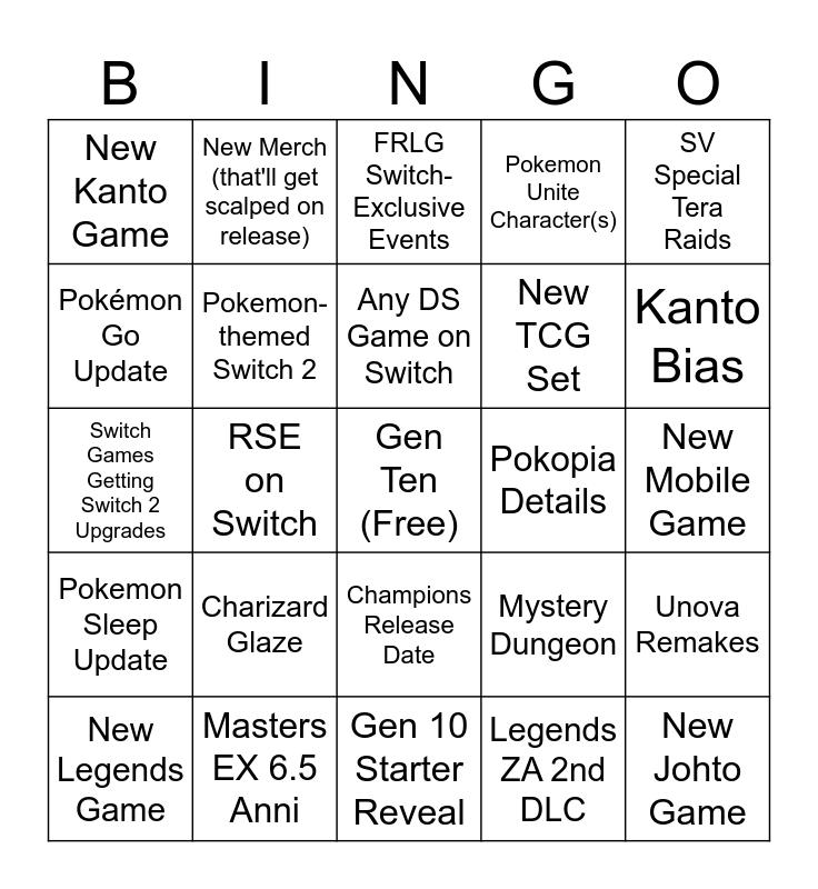 This bingo card has a free space and 24 words: Charizard Glaze, Masters EX 6.5 Anni, Any DS Game on Switch, New Legends Game, SV Special Tera Raids, New Kanto Game, Pokémon Go Update, New Merch (that'll get scalped on release), Pokopia Details, Champions Release Date, New TCG Set, Switch Games Getting Switch 2 Upgrades, Mystery Dungeon, Unova Remakes, Pokemon-themed Switch 2, Legends ZA 2nd DLC, New Mobile Game, FRLG Switch-Exclusive Events, Kanto Bias, RSE on Switch, New Johto Game, Pokemon Sleep Update, Pokemon Unite Character(s) and Gen 10 Starter Reveal.