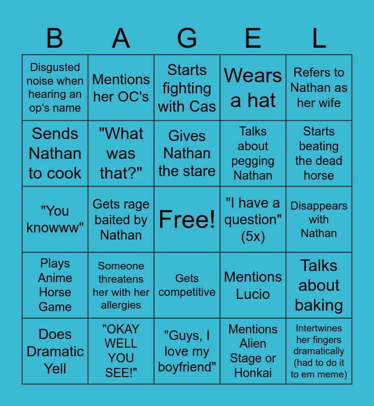 This bingo card has a free space and 24 words: Someone threatens her with her allergies, "OKAY WELL YOU SEE!", Gives Nathan the stare, Does Dramatic Yell, Refers to Nathan as her wife, Disgusted noise when hearing an op's name, Sends Nathan to cook, Mentions her OC's, "I have a question" (5x), Gets competitive, Talks about pegging Nathan, "You knowww", Mentions Lucio, Talks about baking, "What was that?", Mentions Alien Stage or Honkai, Disappears with Nathan, Starts fighting with Cas, Starts beating the dead horse, Gets rage baited by Nathan, Intertwines her fingers dramatically (had to do it to em meme), Plays Anime Horse Game, Wears a hat and "Guys, I love my boyfriend".