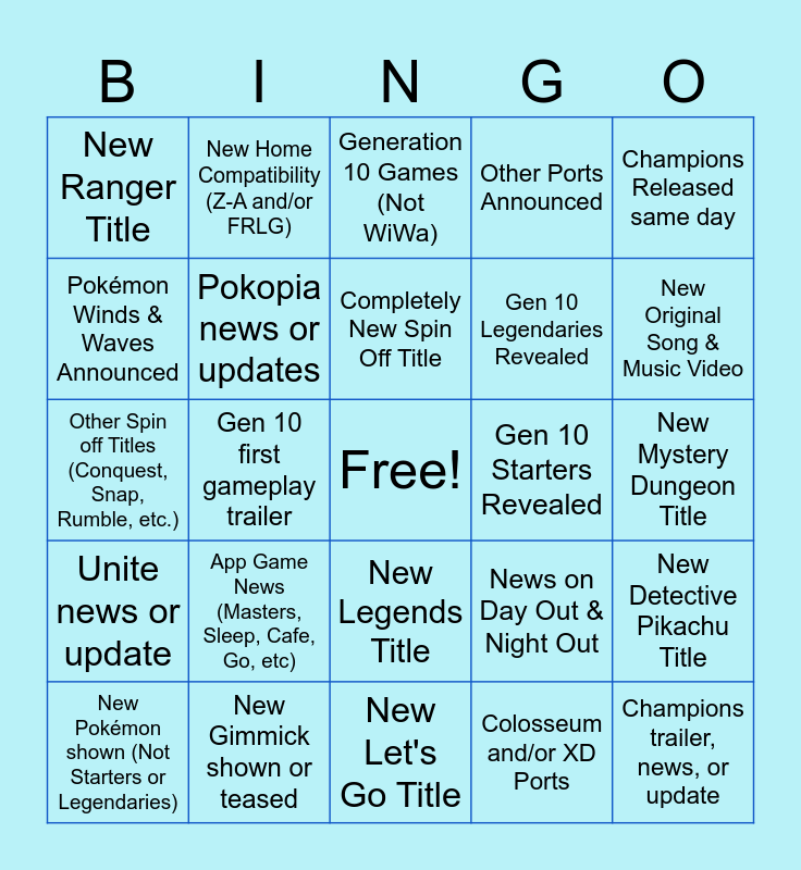 This bingo card has a free space and 24 words: App Game News (Masters, Sleep, Cafe, Go, etc), New Gimmick shown or teased, Completely New Spin Off Title, New Pokémon shown (Not Starters or Legendaries), Champions Released same day, New Ranger Title, Pokémon Winds & Waves Announced, New Home Compatibility (Z-A and/or FRLG), Gen 10 Starters Revealed, New Legends Title, Gen 10 Legendaries Revealed, Other Spin off Titles (Conquest, Snap, Rumble, etc.), News on Day Out & Night Out, New Detective Pikachu Title, Pokopia news or updates, Colosseum and/or XD Ports, New Mystery Dungeon Title, Generation 10 Games (Not WiWa), New Original Song & Music Video, Gen 10 first gameplay trailer, Champions trailer, news, or update, Unite news or update, Other Ports Announced and New Let's Go Title.